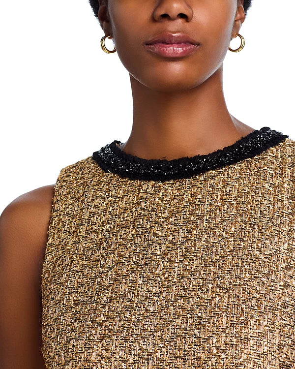 Chic and elegant, this gold dress wit black embellishment around the neckline is a show stopper. Original MSRP $550.