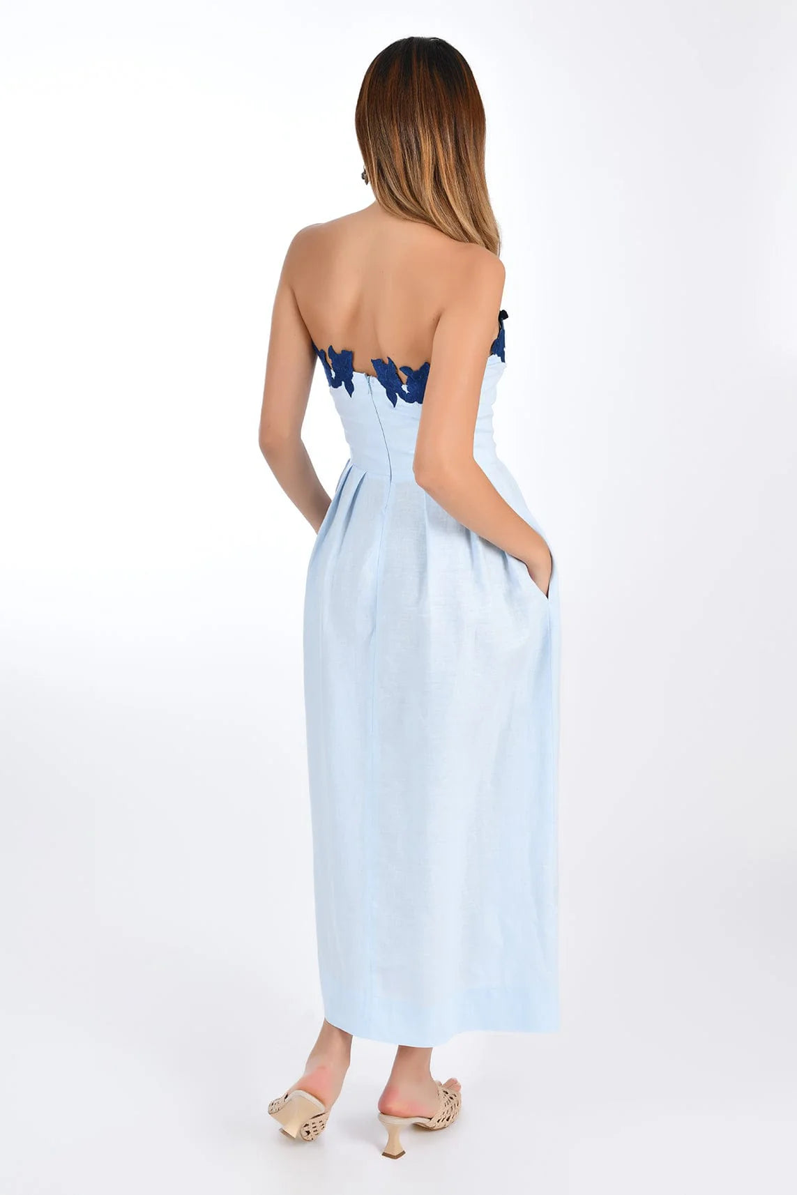 The unmatched Lorr is strapless linen dress featuring a sheath silhouette and embellished with hand embroidered floral appliques in complimenting colors along the neckline.