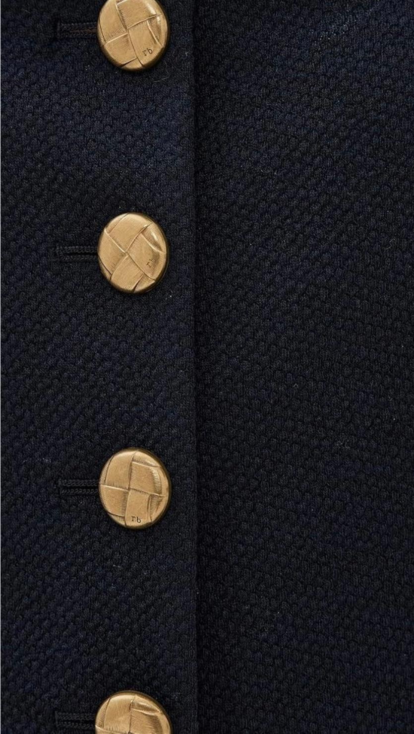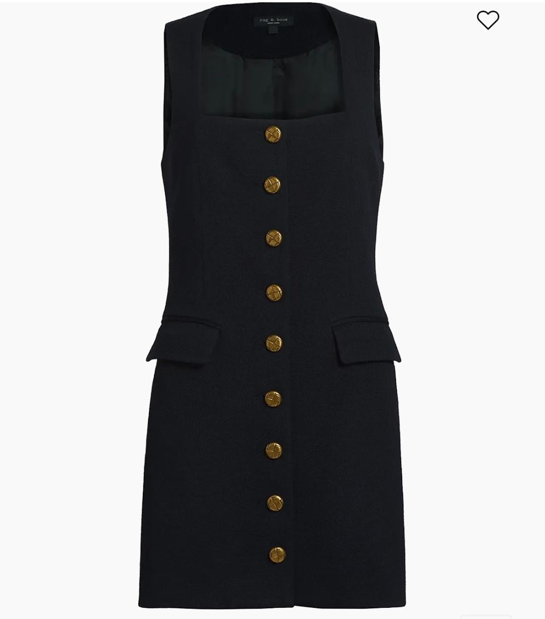 Textured mini-dress with gold buttons, square neckline. Size 14